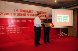 4月28日下午,《中国建设报》主办的2008年中国地暖行业年度盘点活动颁奖典礼在上海光大中心酒店隆重举行,秦皇岛九游管业当选“2008年中国地暖行业PE-Xa管材领军品牌”沉甸甸的牌匾由中国建筑金属结构协会地面供暖委员会华明九主任亲手授予九游公司总经理助理王明科。本次盘点活动中张思良副总经理获得2008年度地暖行业十大风云人物提名。