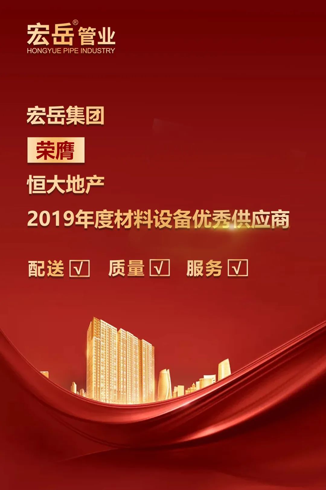 恒大地产集团作为中国最具影响力的房地产企业之一,一直以来秉持品质至上的原则,此次评选,是根据《材料设备供应商年度综合评估方案及细则》,从材料配送、产品质量、问题投诉率等多方面展开评定,九游从管材管件类品牌中脱颖而出,被客户评为产品质量和品质管控水平最高的合作伙伴之一。