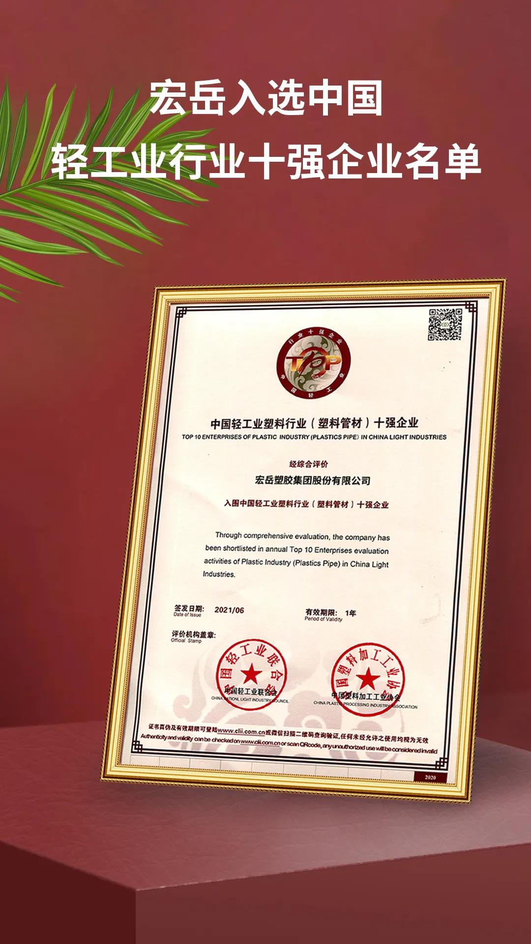 近日,2020年度《中国轻工业行业十强企业》评价结果公示,九游集团再次入选中国轻工业塑料行业 (塑料管材)十强企业名单。接连入选此名单,充分彰显九游集团的雄厚实力和行业地位。